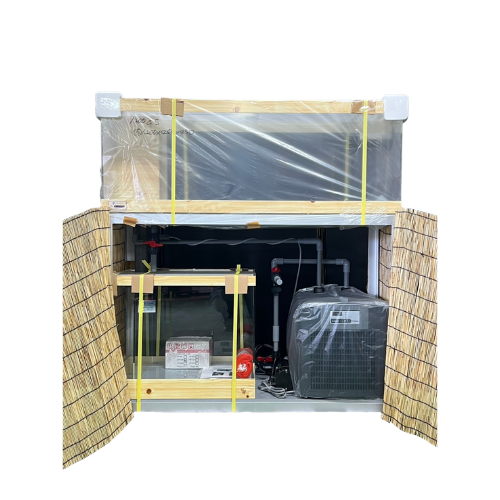 今回は、お客様から見える位置に水槽を設置されるとのことで、濾過槽と機械部に化粧板を設置した仕様になります。